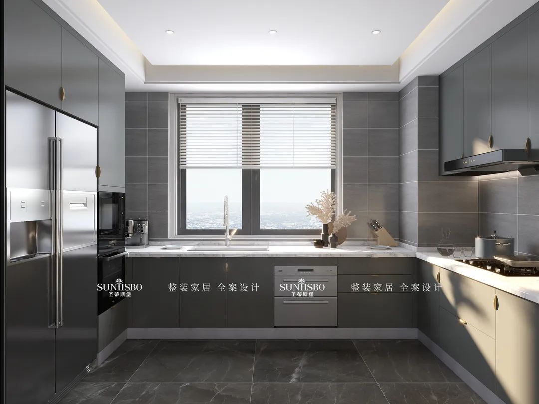 餐廳的設計采用整墻定制的餐邊柜,高級灰讓空間調性瞬間得到提升,半透明的玻璃展示區,營造了多樣的空間和充滿極簡藝術氣息的生活體驗。