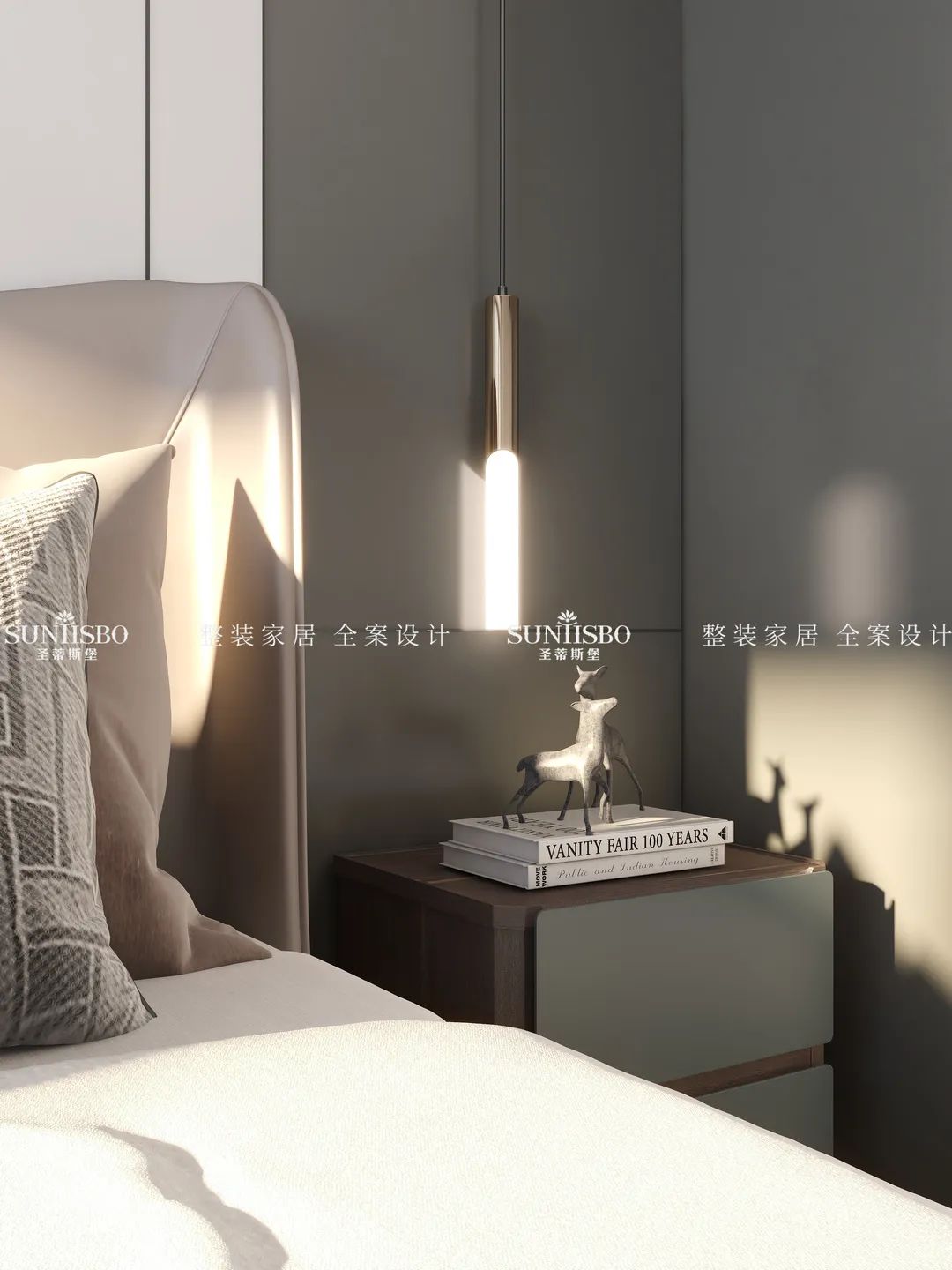 原色的木地板、淺灰的衣柜,搭配簡約的背景墻,整個空間都呈現著祥和靜謐的氛圍。游走的光影,絕佳的開闊視野,使得空間充滿無限張力。黃綠拼接的窗簾,配合柔和的層板燈,營造舒適溫馨的起居氛圍。