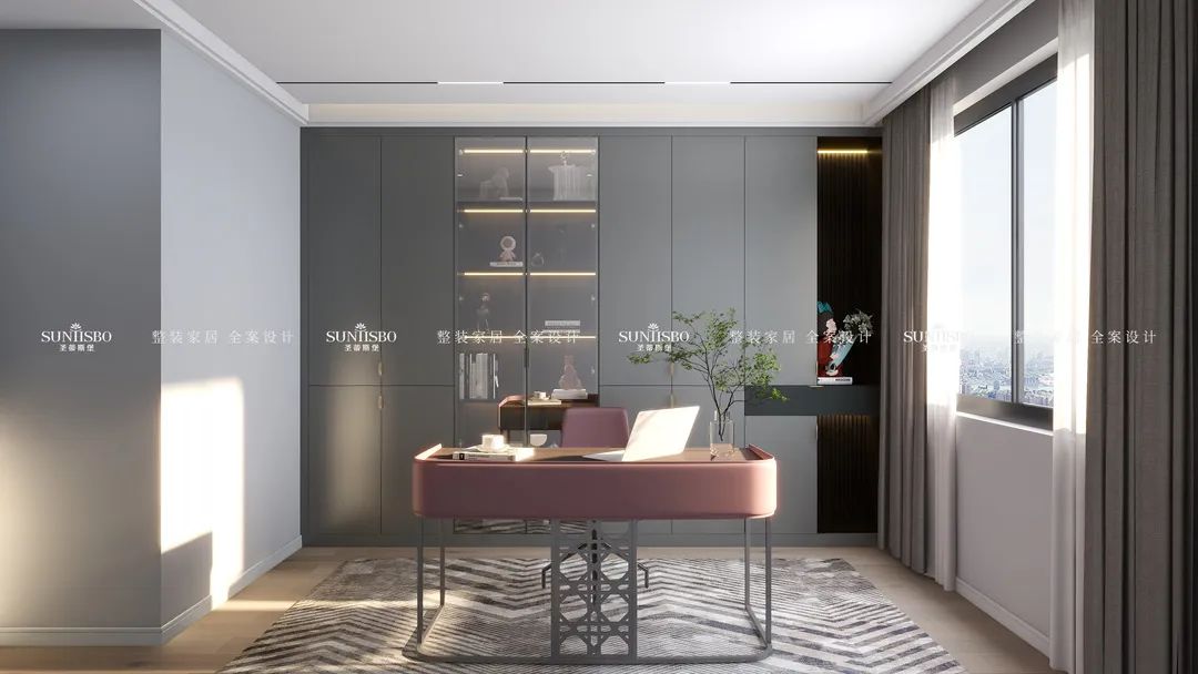 啞灰的定制書柜,冷靜理性,帶來思緒上井然有序的細密邏輯。天然原生的光感,讓視覺達到完美平衡。書房特意配上多裂綠植,讓現代簡約與傳統文化結合,萌發出別出心裁的設計,展現業主對傳統文化情結的喜愛。